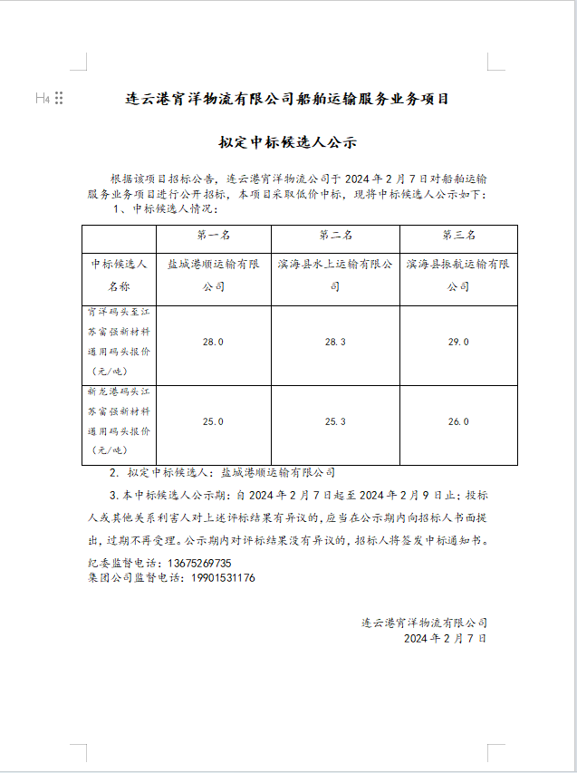 連云港宵洋物流有限公司船舶運(yùn)輸服務(wù)業(yè)務(wù)項目擬定中標(biāo)候選人公示