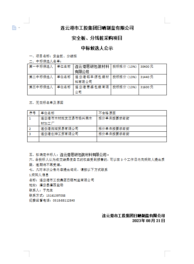 連云港市工投集團(tuán)日曬制鹽有限公司 安全板、分線樁采購(gòu)項(xiàng)目 中標(biāo)候選人公示