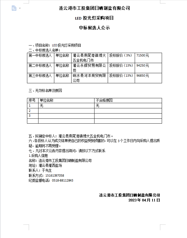 連云港市工投集團(tuán)日曬制鹽有限公司LED投光燈采購項(xiàng)目中標(biāo)候選人公示