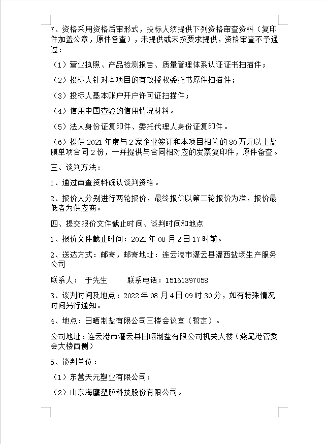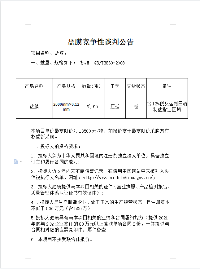 鹽膜競爭性談判公告