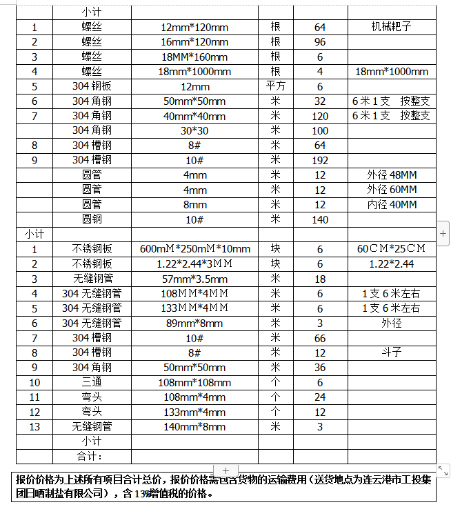 單價(含13%稅、運輸費用)。合同期間304不銹鋼單價不以304不銹鋼市場單價的變動而作任何調(diào)整。