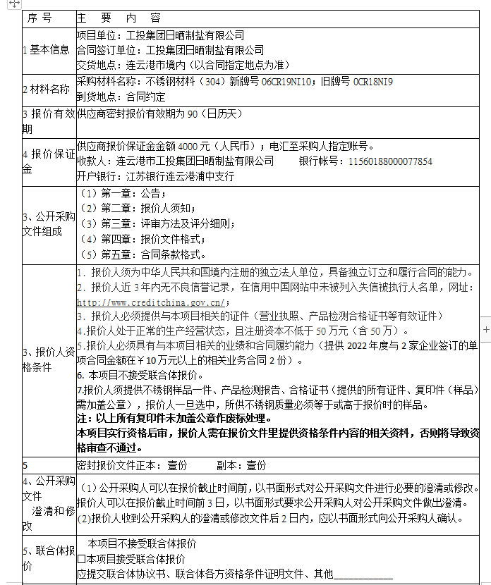 報價保證金接收人:連云港市工投集團日曬制鹽有限公司。