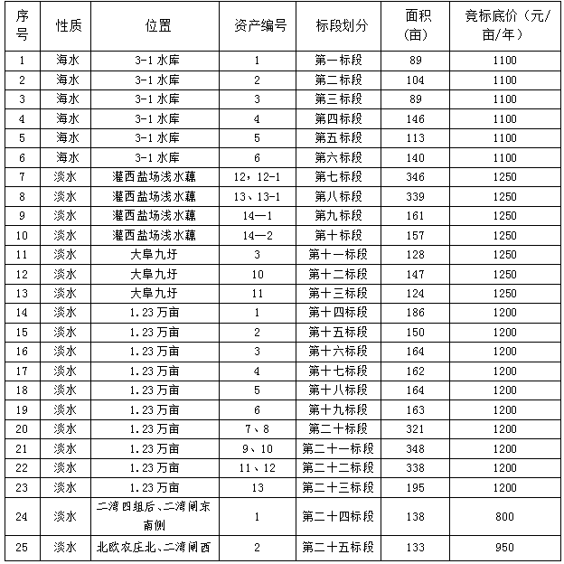 三、競(jìng)租池塘各標(biāo)段競(jìng)標(biāo)底價(jià):
