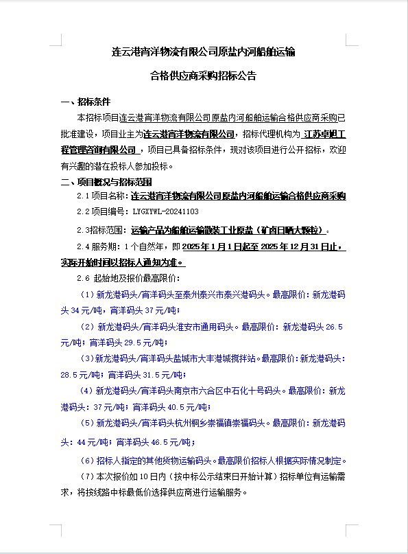 連云港宵洋物流有限公司原鹽內河船舶運輸合格供應商采購招標公告