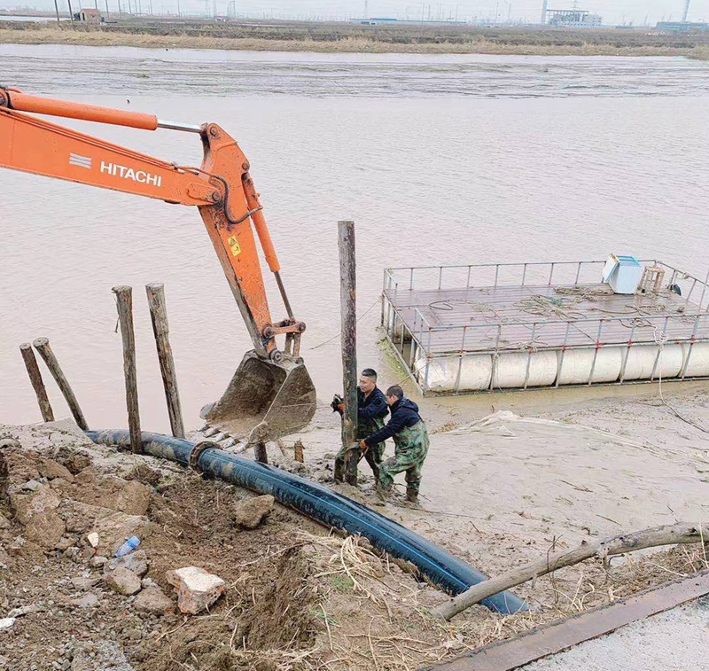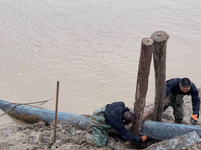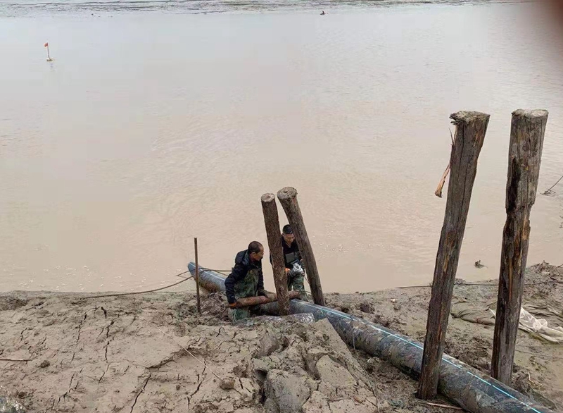 ?一想到昨天管道巡查到這里的情形,現(xiàn)在還讓人“心有余悸”!因管道地處善后河彎道處,常年的泄洪沖刮將河邊覆蓋管道的泥土沖刷卷走,使得岸邊泥土下原本穿越的PE315管道已經(jīng)暴露出來,退潮時(shí)的旋流不斷地沖撞著漂浮起來的鈣液管道,劇烈抖動(dòng)著的管道不時(shí)發(fā)出“噗噗的低吼”隨時(shí)可能折斷。埒子口潮河段是鈣液東輸灌西管道最長(zhǎng)的一節(jié)過河穿越,全長(zhǎng)約300米。穿越管道如果折斷在河底后果將不可想象、經(jīng)濟(jì)損失也是不可估量的,這一幕讓在場(chǎng)所有人員都為之捏了一把汗!