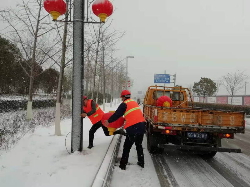 一夜的狂風(fēng)暴雪將花果山大道路上的亮化燈籠刮掉不少,該項工程是翔立分公司今年承接開發(fā)區(qū)市政第一個亮化工程,安裝維護(hù)質(zhì)量的好壞決定著這該項目工程的能否持續(xù)承接。帶著一份堅守、心懷責(zé)任、更帶著翔立轉(zhuǎn)型發(fā)展的希望,“鐵軍”們一大早就已經(jīng)整裝待發(fā),奔赴施工現(xiàn)場收集整理燈籠。