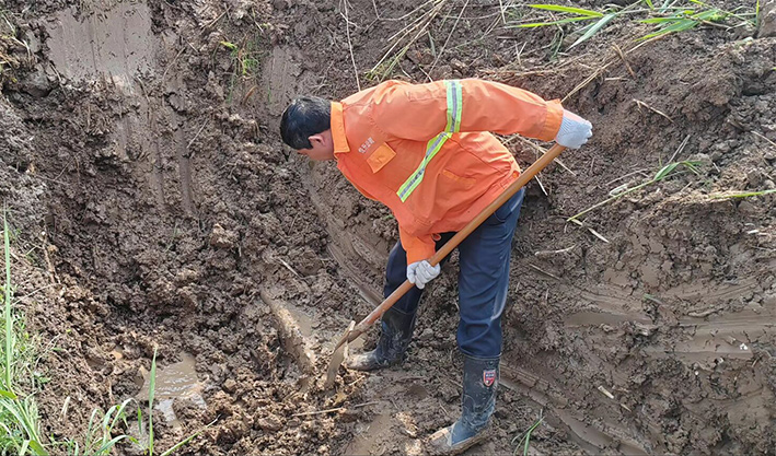 市政分公司組織搶修人員迅速到場,調(diào)集挖機與搶修材料,有序開展應急搶修。維修人員首先對漏水管道實施開挖,經(jīng)過維修人員仔細挖開后確定直徑110PVC管道老化導致管道連接端裂開。查明原因后,制定了相應可行的搶修方案。搶修過程中,大伙不畏困難、分工有序,相互協(xié)作,在滿是泥濘的坑中開展維修作業(yè)。機械開挖、人工配合清淤、更換損壞管道、增設(shè)哈夫節(jié)等一系列的步驟,一通操作下來,搶修人員人人汗流浹背。經(jīng)過3個多小時連續(xù)奮戰(zhàn),高效完成此次搶修任務。