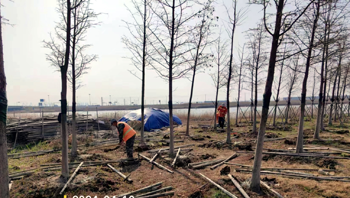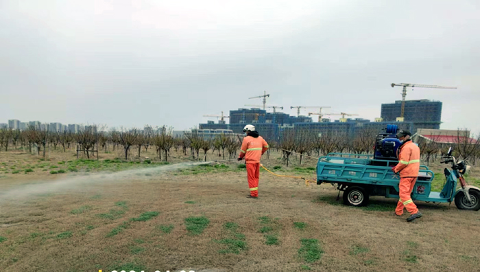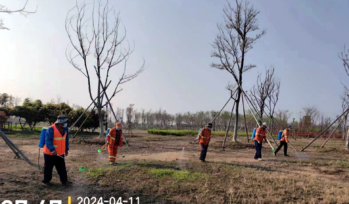 積極澆灌返青水。當前,地溫回升快,苗木易萌芽,該班組采用“人工+機械”相結合的方式,全面啟動返青水集中澆灌工作,重點對園區(qū)喬木、果木、草坪等進行全面灌溉,促進苗木、草坪返青發(fā)芽。按照分種類、合理澆灌的原則,采取集中澆灌的方式最大限度減緩晝夜溫差對綠化植物的影響,入春后共澆水100余次,對落羽杉圓動力灌根2000棵,對大樹澆水1500棵,綠化澆水約30000平方米。