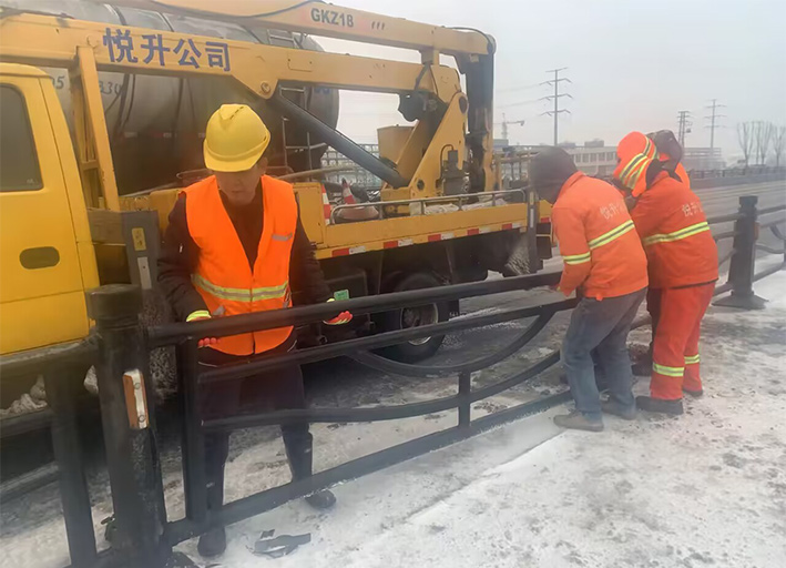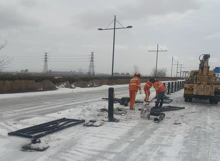 近兩日,因雨雪天氣,道路結(jié)冰濕滑,車輛行駛過程中發(fā)生意外,造成港前大道、海濱大道、228國道等地段發(fā)生多起道路護(hù)欄等設(shè)施損壞情況。收到信息后,市政分公司道路養(yǎng)護(hù)人員迅速反應(yīng),在班長孫寬成帶領(lǐng)下,隊員們頂風(fēng)冒雪第一時間趕赴現(xiàn)場。