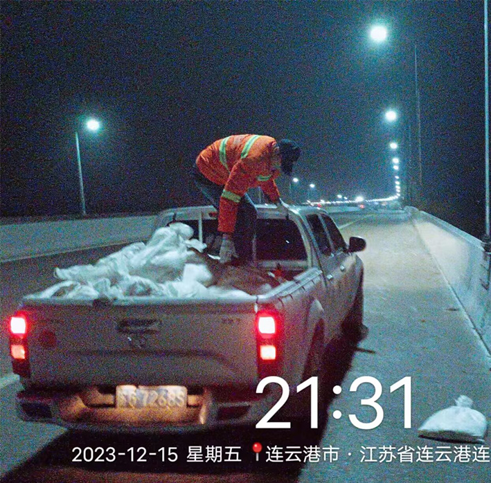 1215日夜間21時左右,受寒潮影響,徐圩大地瞬間飄落鵝毛般雪花。為保障新城主要干道車輛、行人往來石化園區(qū)安全暢通經(jīng)過。保潔分公司結(jié)合徐圩城建與悅升公司冬季突發(fā)天氣處置預(yù)案,聞雪而動,第一時間啟動布放融雪劑工作,大橋兩側(cè)盡顯保潔人無懼嚴寒勞動場景。